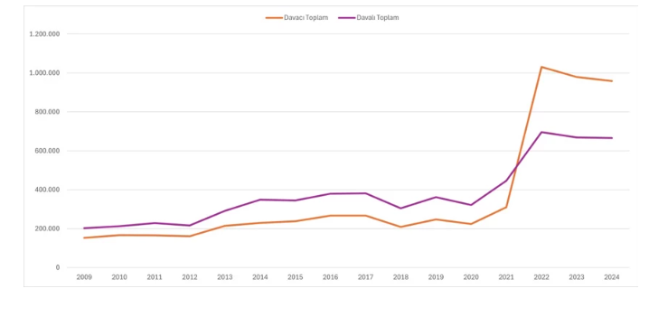2009 yılında açılan alacak savası sayısı 140 bin 252 olurken, 2024 yılında bu sayı 653 bin 789 çıkarak 15 yılda yüzde 366 oranında artış gösteriyor.
