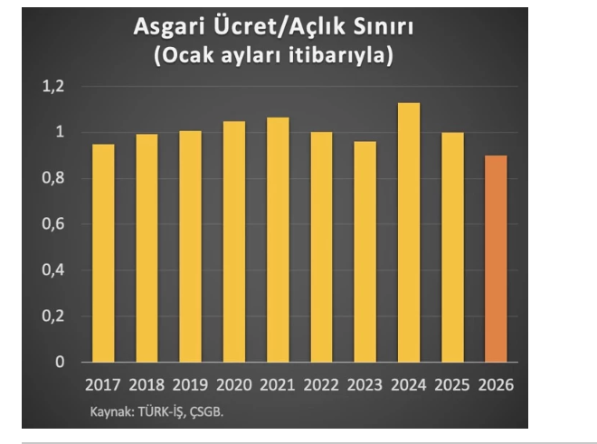 Ocak ayları temel alınarak hazırlanan grafikte, minimum fiyatın açlık sonuna oranı 2017-2026 devrinde dalgalı bir görünüm sergilerken, 2026 yılı prestijiyle bu oranın son on yılın en düşük seviyesine indiği görülüyor. Grafik, minimum fiyatın açlık hududunu karşılama gücündeki zayıflamayı ortaya koyuyor.