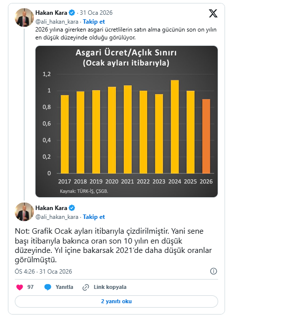 Kara, “2026 yılına girerken taban ücretlilerin satın alma gücünün son on yılın en düşük seviyesinde olduğu görülüyor” derken, şu grafiği de paylaştı: