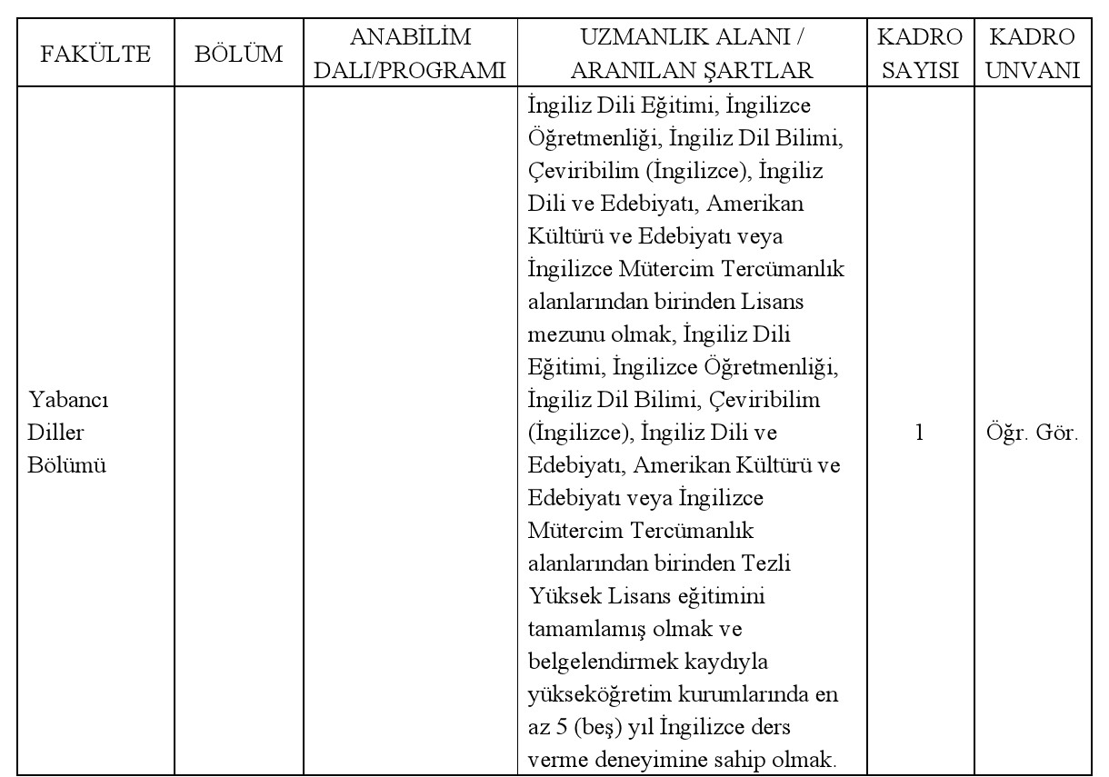 Üniversitemize 2547 sayılı Yükseköğretim Kanunu’nun ve 09.11.2018 tarihli, 30590 sayılı Resmi Gazete’de yayımlanan Öğretim Üyesi Dışındaki Öğretim Elemanı Takımlarına Yapılacak Atamalarda Uygulanacak Merkezi İmtihan ile Giriş İmtihanlarına Ait Tarz ve Temeller Hakkında Yönetmeliği’nin ilgili hususları uyarınca “Öğretim Elemanı” alınacaktır.