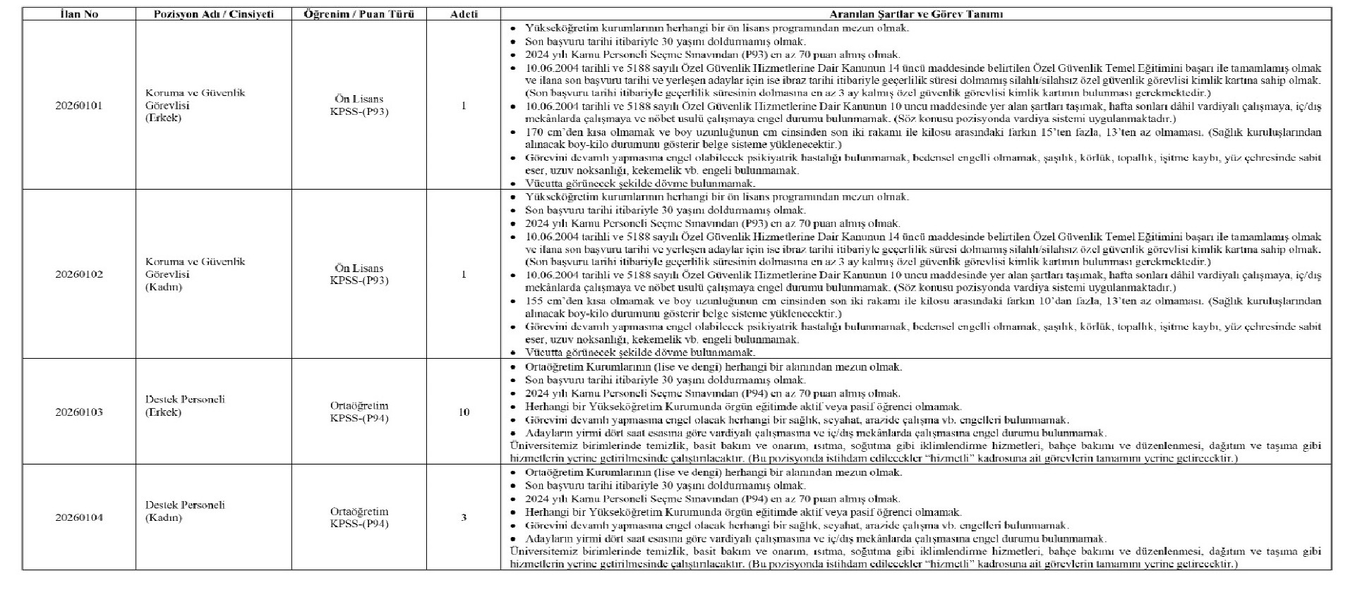 657 sayılı Devlet Memurları Kanununun 4. hususunun (H) fıkrasına nazaran Üniversitemizde istihdam edilmek üzere 06.06.1 97X gün ve 7.’] 5754 sayılı Hakanlar Kurulu Kararı ile yürürlüğe giren Kontratlı İşçi Çalıştırılmasına Ait Asılların ek 2. unsurunun (b) fıkrasına nazaran yazılı ve kelamlı imtihan yapılmaksızın 2024 KPSS (B) kümesi (ön lisans mezunlarında KPSSP93 ve ortaöğretim mezunlarında KPSNP94 puan çeşitleri dikkate alınacaktır.) puan sıralaması temel alınmak suretiyle ilanda müracaat kurallan belirtilen konumlara toplam 15 (On Beş) adet kontratlı işçi alınacaktır.