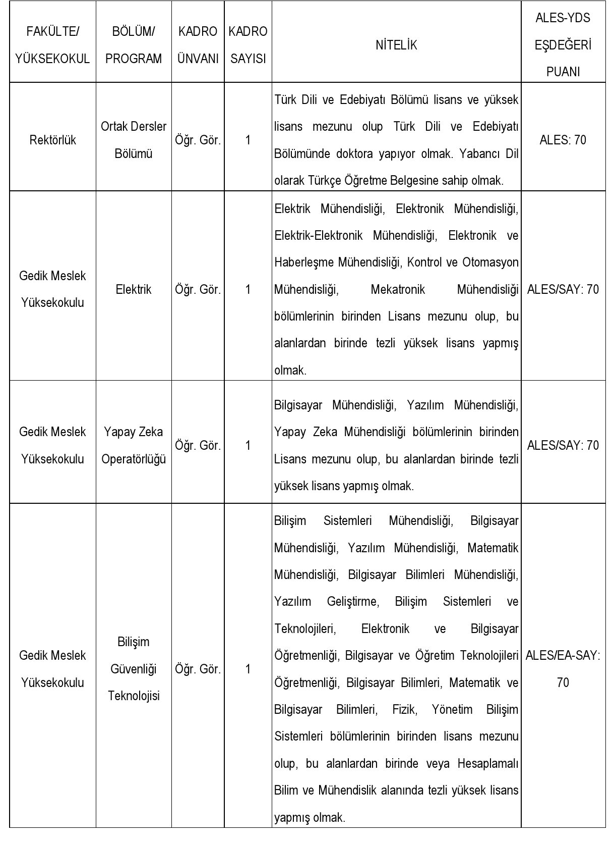 Üniversitemize 2547 sayılı Yükseköğretim Kanunu’nun ve Öğretim Üyesi Dışındaki Öğretim Elemanı Takımlarına Yapılacak Atamalarda uygulanacak Merkezi İmtihan ile Giriş İmtihanlarına Ait Adap ve Asıllar Hakkında Yönetmelik yeterince öngörülen şartları sağlamış olmak kuralı ile aşağıda belirtilen takımlara öğretim elemanı alınacaktır.