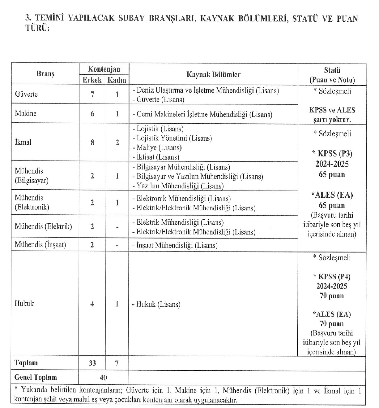 Sahil Güvenlik Komutanlığı karargahı ile bağlısı birlik ve kurulularında istihdam edilmek üzere, Jandarma ve Kıyı Güvenlik Akademisi Başkanlığında eğitim-öğretim görecek; 40 kontratlı subay temin edilecektir.