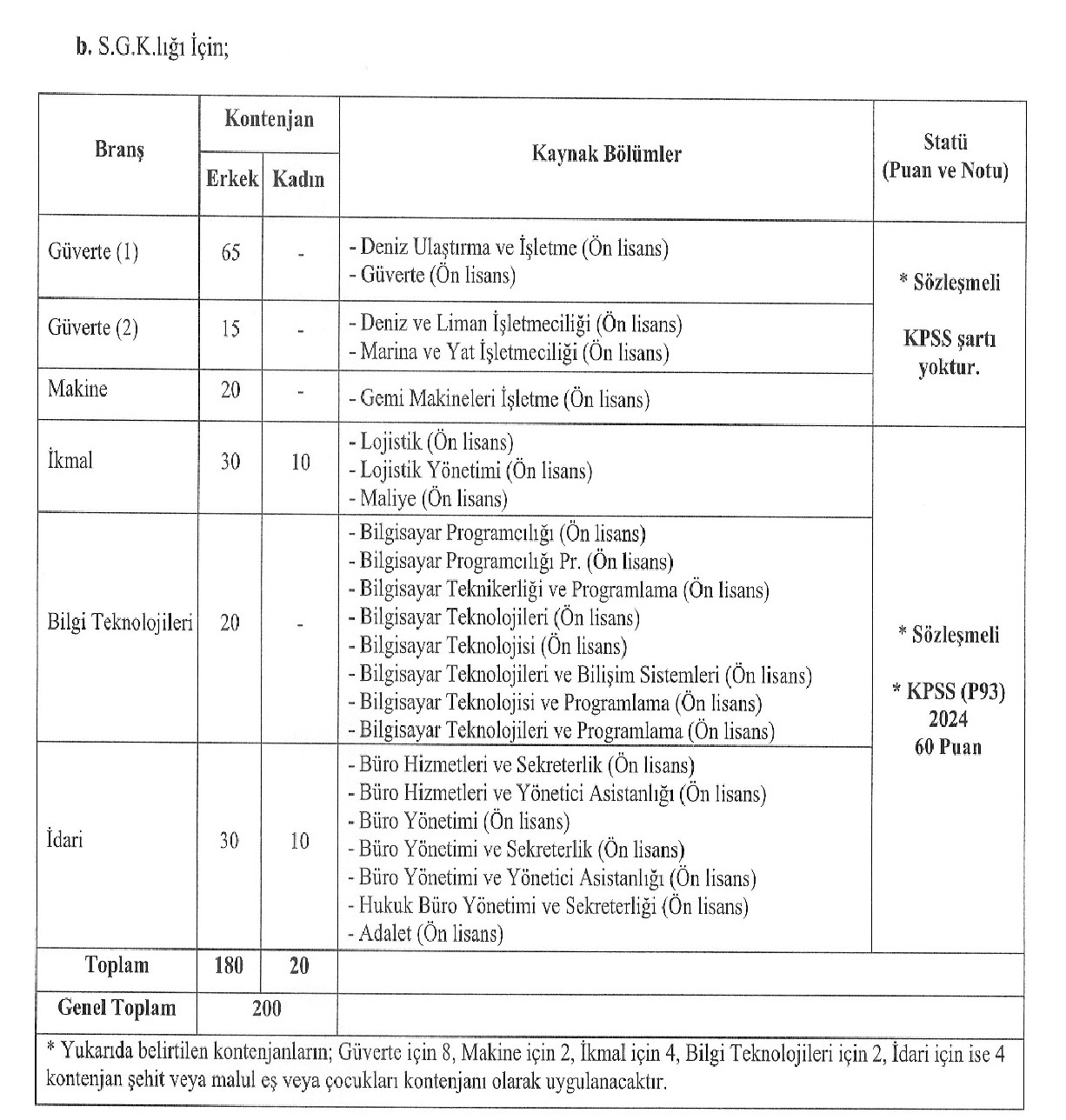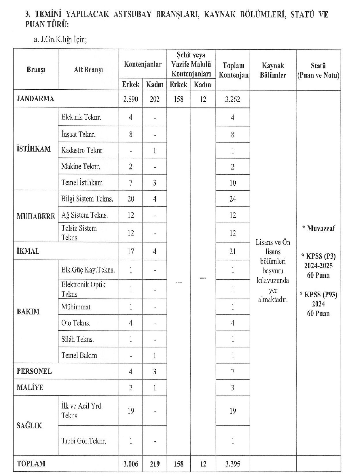 Jandarma Genel Komutanlığı ve Kıyı Güvenlik Komutanlığı karargahı ile bağlısı birlik ve kumrularında istihdam edilmek üzere, Jandarma ve Kıyı Güvenlik Akademisi Başkanlığında eğitim-öğrelim görecek; J.Gn.K.bğı için 3.395 muvazzaf astsubay (erkek/kadm), S.G.K.lığı için 200 kontratlı astsubay (erkek/kadın) temin edilecektir.