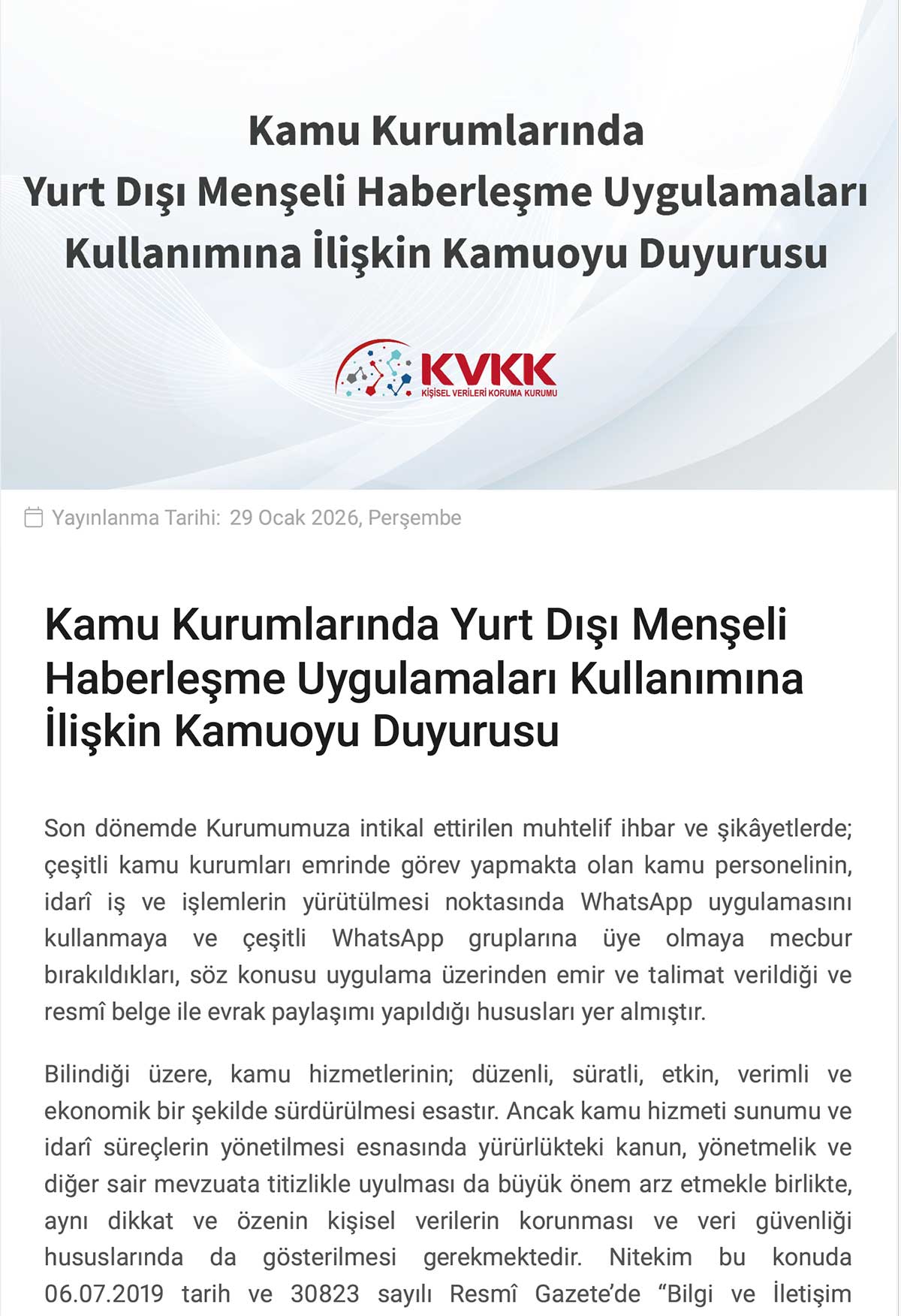 KVKK, 29 Ocak tarihinde yayımladığı kamuoyu duyurusunda, çok sayıda kamu kurumunda idari süreçlerin WhatsApp üzerinden yürütüldüğüne ilişkin ihbar ve şikayetler aldığını açıkladı. Duyuruda; kamu işçisinin WhatsApp kümelerine mecburî olarak dahil edildiği, bu kümeler üzerinden buyruk ve talimat verildiği ve hatta resmi evrak paylaşıldığı tespitlerine yer verildi.