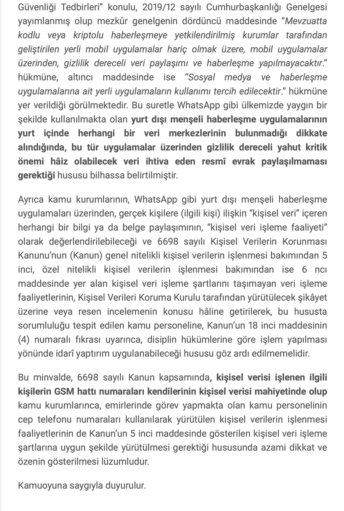 KVKK açıklamasında, 6 Temmuz 2019 tarihli ve 30823 sayılı Resmi Gazete’de yayımlanan 2019/12 sayılı Cumhurbaşkanlığı Genelgesine atıf yapıldı. Genelgede;