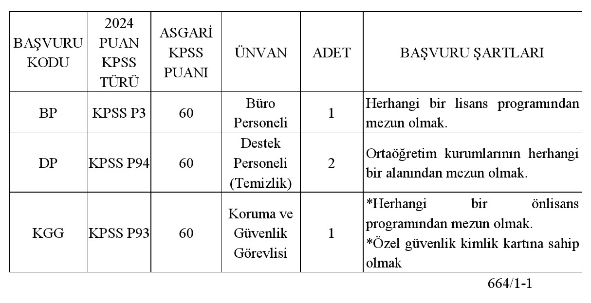 Üniversitemizde istihdam edilmek üzere, 657 sayılı Devlet Memurları Kanunu’nun 4. unsurunun (B) fıkrasına nazaran 06.06.1978 tarihli ve 7/15754 sayılı Kararnameye ekli 28.06.2007 tarihli ve 26566 sayılı Resmi Gazete’de yayımlanan Kontratlı İşçi Çalıştırılmasına Ait Temellerde Değişiklik Yapılmasına Dair Esaslar’da yer alan Ek 2. hususun (b) fıkrasına nazaran 2024 KPSS (B) kümesi puan sırası temel alınmak suretiyle kontratlı işçi alınacaktır.
