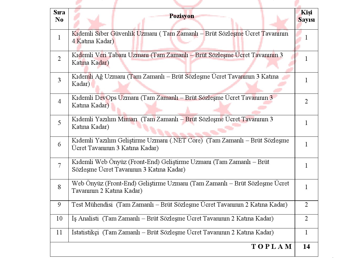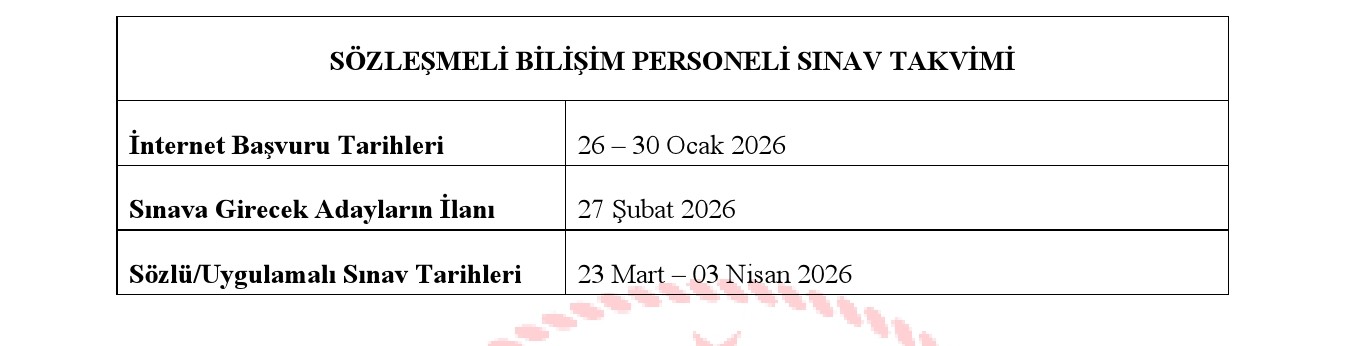 Bakanlığımız buyruğunda istihdam edilmek üzere 31.12.2008 tarih ve 27097 sayılı Resmi Gazete’de yayımlanan “Kamu Kurum ve Kuruluşlarının Büyük Ölçekli Bilgi Süreç Ünitelerinde Kontratlı Bilişim İşçisi İstihdamına Ait Temel ve Tarzlar Hakkında Yönetmelik” in 8’inci unsuru uyarınca; 2024 ve 2025 tarihlerinde yapılan Kamu İşçisi Seçme İmtihanında alınan KPSSP3 puanının yüzde 70 (yetmiş)’i (KPSS puanı olmayan yahut doküman ibraz etmeyen adayın KPSS puanı 70 (yetmiş) olarak dikkate alınır.) ile YDS yahut buna denkliği Yükseköğretim Kurulunca kabul edilen puanın yüzde 30 (otuz)’unun toplamı temel alınarak (YDS yahut dengi puanını ibraz etmeyenlerin yabancı lisan puanı 0 (sıfır) olarak hesaplanacaktır) yapılacak sıralamaya nazaran en yüksek puana sahip adaydan başlanarak kontratlı bilişim çalışanı konumunun 10 (on) katı aday ortasından, Bakanlığımız tarafından 23 Mart – 03 Nisan 2026 tarihleri ortasında gerçekleştirilecek sözlü/uygulamalı imtihan sonucunda oluşacak muvaffakiyet sırasına nazaran 14 (on dört) kontratlı bilişim işçisi alınacaktır.