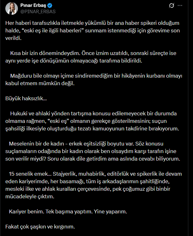 “Her haberi tarafsızlıkla iletmekle yükümlü bir ana haber spikeri olduğum halde, “eski eş ile ilgili haberleri” sunmam istenmediği için vazifeme son verildi.