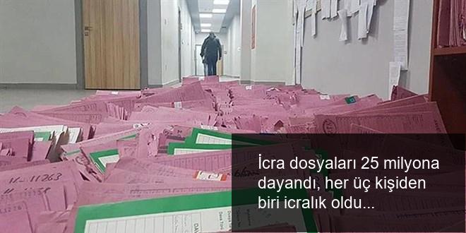 Artan borç yükü şirketleri ve bireyleri çıkmaza sürüklerken, icra dairelerindeki belge sayısı 25 milyona yaklaştı. 86 milyonluk Türkiye’de her üç şahıstan birinin icralık olması ekonomik sıkışmanın boyutlarını gözler önüne serdi.