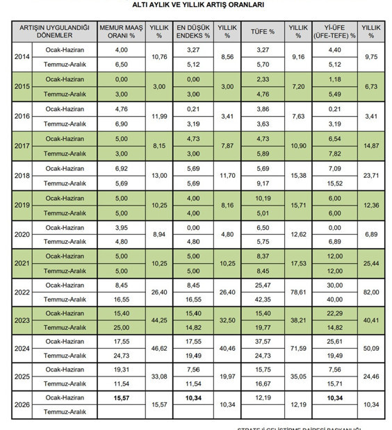 Bu kapsamda, 1 Temmuz-31 Aralık 2025 devrine ilişkin memur maaş artış oranı temel alınacak ve kelam konusu oran yüzde 15,57 olarak uygulanacak. Belirlenen artış oranı, 2026’nın birinci 6 ayı boyunca geçerli olacak.