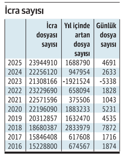 2025 yılı Kasım sonu prestijiyle karşılıksız çek meblağı 225 milyar liranın üzerine çıkarken, protestolu senet meblağı 81 milyar lirayı aştı. İcra dairelerine ulaşan icra iflas belgesi sayısı ise 2025 yılı sonu prestijiyle 24 milyonun üzerine çıktı. Bir diğer söz ile 86 milyonluk Türkiye’de her üç şahıstan biri icralık oldu. 2025 yılı prestijiyle günlük icra belgesi sayısı ortalama 4 bin 691 oldu.