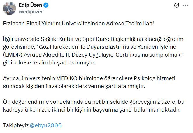 31 Aralık 2025 tarihli “Maliye Mezunları Alanındaki Bu Takıma Başvuramıyor” başlıklı yazımızda; Erzincan Binali Yıldırım Üniversitesi tarafından Maliye programına alınacak öğretim vazifelisi ilanında Maliye alanında lisans ve lisansüstü eğitim görmüş bireylere müracaat bahtı verilmediğine dikkat çekmiştik.