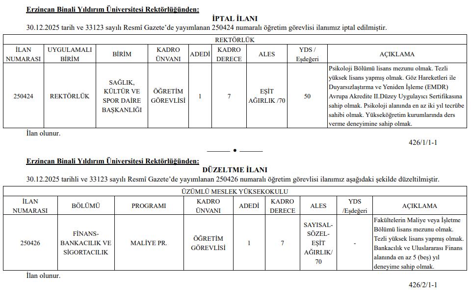 Erzincan Binali Yıldırım Üniversitesi tarafından her iki konuda yaptığı yine kıymetlendirme sonrası, Maliye mezunlarına müracaat talihi verirken, başka öğretim vazifelisi takımını ise iptal etmiştir.