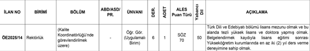 “Türk Lisanı ve Edebiyatı kısmı lisans mezunu olmak ve bu alanda tezli yüksek lisans ve doktora yapmış olmak. Belgelendirmek kaydıyla lisans eğitimi sonrası yükseköğretim kurumlarında en az 2 (iki) yıl ders verme tecrübesine sahip olmak”